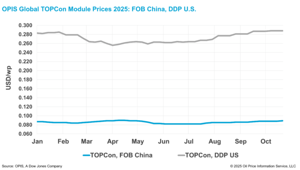 According to the OPIS Solar Weekly Report released on October 21, The Chinese Module Marker (CMM), OPIS’s benchmark for TOPCon modules above 600W, rose 1.14% to $0.089/W Free-On-Board (FOB) China, with indications between $0.086-0.093/W.